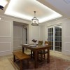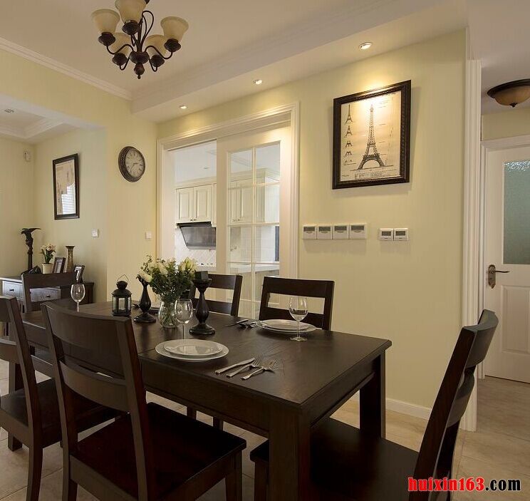本套空间内美式风格的装饰设计展现的比较明显,石膏板吊顶采用了平顶式的设计,可以将中间黑色的铁艺吊灯衬托的更加别致买也可以凸显出独特的美感,下方的实木餐桌虽然会为空间带来一丝古典气息,但整体的设计与搭配并不会使人们觉得压抑。
