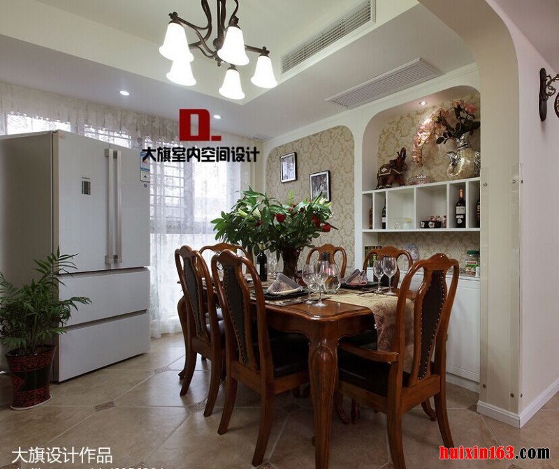 本套空间内美式风格的装饰设计展现的比较明显,石膏板吊顶采用了平顶式的设计,可以将中间黑色的铁艺吊灯衬托的更加别致买也可以凸显出独特的美感,下方的实木餐桌虽然会为空间带来一丝古典气息,但整体的设计与搭配并不会使人们觉得压抑。