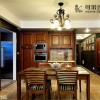 本套空间内美式风格的装饰设计展现的比较明显,石膏板吊顶采用了平顶式的设计,可以将中间黑色的铁艺吊灯衬托的更加别致买也可以凸显出独特的美感,下方的实木餐桌虽然会为空间带来一丝古典气息,但整体的设计与搭配并不会使人们觉得压抑。