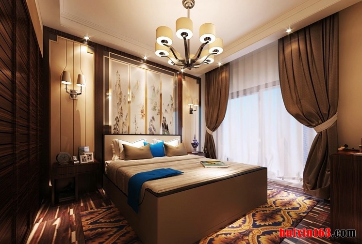 卧室古典元素与现代材质的巧妙兼柔,家具、窗棂、布艺床品相互辉映,再现了移步变景的精妙小品,将其中的经典元素提炼并加以丰富,同时改变原有空间布局中等级、尊卑等封建思想,卧室干净利落、简洁的设计,简单的色调。给传统家居文化注入了新的气息。整体看上去舒服,清爽,又显得安逸。顶面上采用射灯照明,光线更加的均匀明亮。