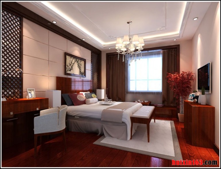 卧室石膏板吊顶,木质雕花线框装饰,造型简约的圆形吸顶灯安装在卧室吊顶中央,明亮的灯带及小射灯四周装饰。木质简约电视柜搭配,营造出了温馨古朴、文雅清丽的古典风格家居。明清时期家居理念的精华,当然,并不是对那个遥远朝代的家装行照般的意思,而是加入现代的生活理念和空间布局。