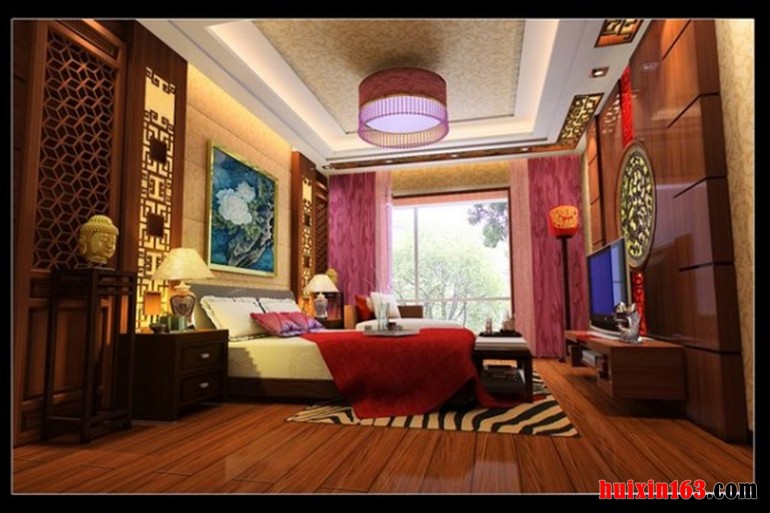 卧室石膏板吊顶,木质雕花线框装饰,造型简约的圆形吸顶灯安装在卧室吊顶中央,明亮的灯带及小射灯四周装饰。木质简约电视柜搭配,营造出了温馨古朴、文雅清丽的古典风格家居。明清时期家居理念的精华,当然,并不是对那个遥远朝代的家装行照般的意思,而是加入现代的生活理念和空间布局。
