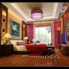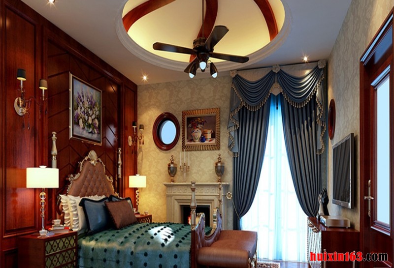 卧室石膏板吊顶,木质雕花线框装饰,造型简约的圆形吸顶灯安装在卧室吊顶中央,明亮的灯带及小射灯四周装饰。木质简约电视柜搭配,营造出了温馨古朴、文雅清丽的古典风格家居。明清时期家居理念的精华,当然,并不是对那个遥远朝代的家装行照般的意思,而是加入现代的生活理念和空间布局。