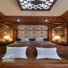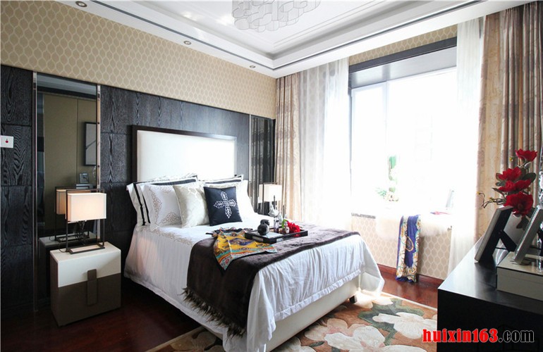 卧室石膏板吊顶,木质雕花线框装饰,造型简约的圆形吸顶灯安装在卧室吊顶中央,明亮的灯带及小射灯四周装饰。木质简约电视柜搭配,营造出了温馨古朴、文雅清丽的古典风格家居。明清时期家居理念的精华,当然,并不是对那个遥远朝代的家装行照般的意思,而是加入现代的生活理念和空间布局。