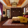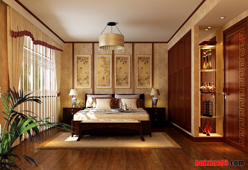 卧室简单和造型配上古典家具,古典的风格便淋漓尽致的展现出来。吊顶的实木圈边和电视的的实木雕花和谐统一,使得古典的元素多而不乱,植物的点缀更能起到相得益彰的效果,就像置身大自然中。