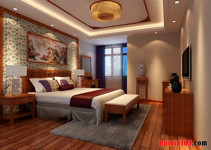 卧室简单和造型配上古典家具,古典的风格便淋漓尽致的展现出来。吊顶的实木圈边和电视的的实木雕花和谐统一,使得古典的元素多而不乱,植物的点缀更能起到相得益彰的效果,就像置身大自然中。