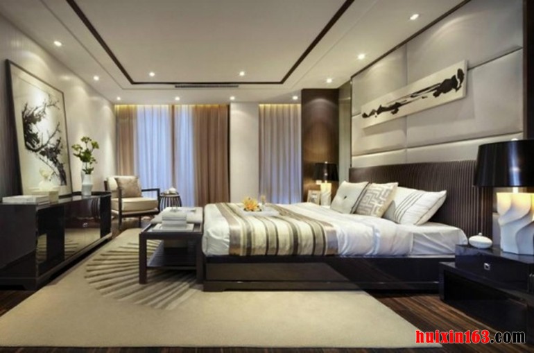 卧室的设计整体以人性化为主,家具的摆放多用对称式的方式,格调随和大气。顶上的吊顶直线条的比较硬,吊顶和背景墙形成鲜明的对比。灯光点缀的巧妙的运用,让空间成功分割清晰,空间层次更为分明。