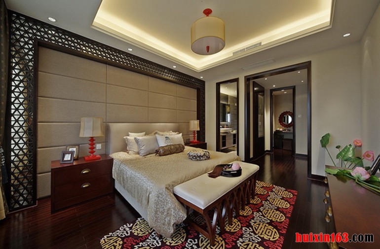 卧室的设计整体以人性化为主,家具的摆放多用对称式的方式,格调随和大气。顶上的吊顶直线条的比较硬,吊顶和背景墙形成鲜明的对比。灯光点缀的巧妙的运用,让空间成功分割清晰,空间层次更为分明。