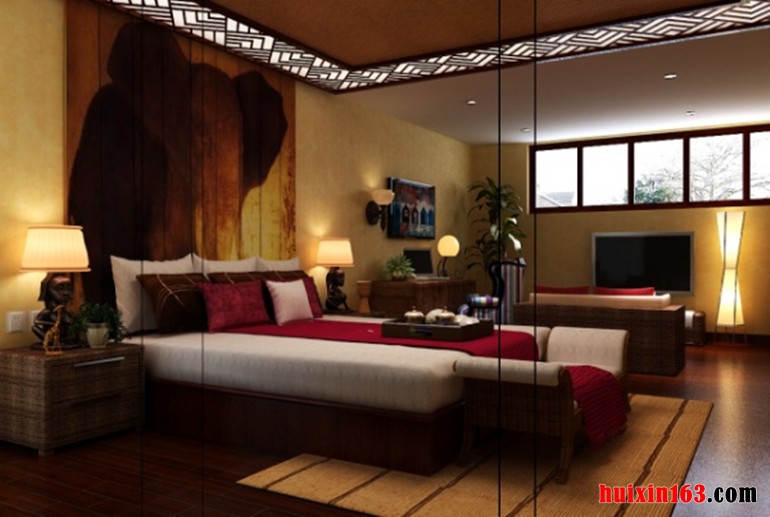 卧室的设计整体以人性化为主,家具的摆放多用对称式的方式,格调随和大气。顶上的吊顶直线条的比较硬,吊顶和背景墙形成鲜明的对比。灯光点缀的巧妙的运用,让空间成功分割清晰,空间层次更为分明。