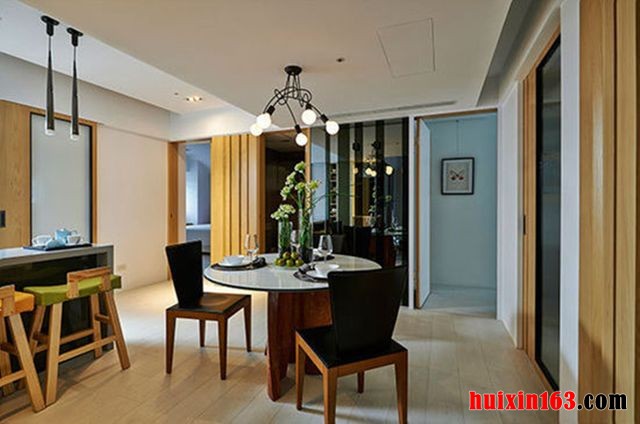 本套餐厅装饰中石膏板吊顶的设计比较简洁,平顶式的造型可以将中间的黑色铁艺吊灯衬托的更加精美、别致,下方的实木餐桌则可以凸显出一种典雅的气息,餐桌的造型设计比较大气,与整体的装饰搭配在一起比较凸显个性。
