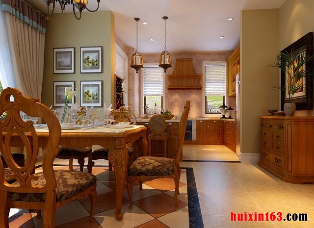 美式田园风格的居室装修可以摒弃掉一切的繁琐与奢华,以最自然最清新的姿态展现在我们面前,它所倡导的是一种质朴归心,强调的是回归自然,这也正是我们所需要、所追求的一种生活方式。 本套餐厅装饰中石膏板吊顶的设计比较简洁,平顶式的造型可以将中间的黑色铁艺吊灯衬托的更加精美、别致,下方的实木餐桌则可以凸显出一种典雅的气息,餐桌的造型设计比较大气,与整体的装饰搭配在一起比较凸显个性。 更多»推荐家装效果图
