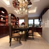 本套餐厅装饰中石膏板吊顶的设计比较简洁,平顶式的造型可以将中间的黑色铁艺吊灯衬托的更加精美、别致,下方的实木餐桌则可以凸显出一种典雅的气息,餐桌的造型设计比较大气,与整体的装饰搭配在一起比较凸显个性。
