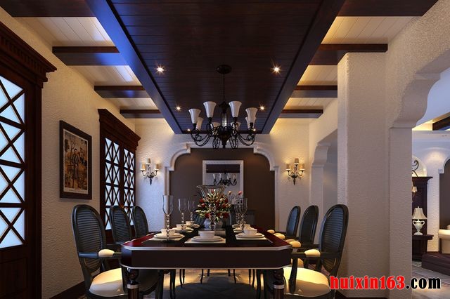 美式田园风格的居室装修可以摒弃掉一切的繁琐与奢华,以最自然最清新的姿态展现在我们面前,它所倡导的是一种质朴归心,强调的是回归自然,这也正是我们所需要、所追求的一种生活方式。 本套餐厅装饰中石膏板吊顶的设计比较简洁,平顶式的造型可以将中间的黑色铁艺吊灯衬托的更加精美、别致,下方的实木餐桌则可以凸显出一种典雅的气息,餐桌的造型设计比较大气,与整体的装饰搭配在一起比较凸显个性。 更多»推荐家装效果图