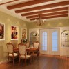 美式田园风格的居室装修可以摒弃掉一切的繁琐与奢华,以最自然最清新的姿态展现在我们面前,它所倡导的是一种质朴归心,强调的是回归自然,这也正是我们所需要、所追求的一种生活方式。 本套餐厅装饰中石膏板吊顶的设计比较简洁,平顶式的造型可以将中间的黑色铁艺吊灯衬托的更加精美、别致,下方的实木餐桌则可以凸显出一种典雅的气息,餐桌的造型设计比较大气,与整体的装饰搭配在一起比较凸显个性。 更多»推荐家装效果图