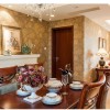 本套餐厅装饰中石膏板吊顶的设计比较简洁,平顶式的造型可以将中间的黑色铁艺吊灯衬托的更加精美、别致,下方的实木餐桌则可以凸显出一种典雅的气息,餐桌的造型设计比较大气,与整体的装饰搭配在一起比较凸显个性。
