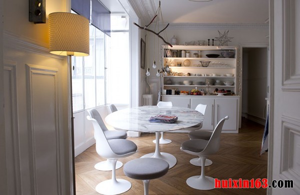 本套餐厅装饰中石膏板吊顶的设计比较具有个性,也不难从中看出时尚装饰的设计感,深色的装饰木条在白色的石膏板背景下显得更加显眼,井格形状的设计虽然简单,但同时也很富有大气之势,与空间内的整体装饰搭配在一起比较协调。