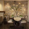 本套餐厅装饰中石膏板吊顶的设计比较具有个性,也不难从中看出时尚装饰的设计感,深色的装饰木条在白色的石膏板背景下显得更加显眼,井格形状的设计虽然简单,但同时也很富有大气之势,与空间内的整体装饰搭配在一起比较协调。