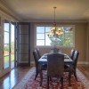 本套餐厅装饰中石膏板吊顶的设计比较具有个性,也不难从中看出时尚装饰的设计感,深色的装饰木条在白色的石膏板背景下显得更加显眼,井格形状的设计虽然简单,但同时也很富有大气之势,与空间内的整体装饰搭配在一起比较协调。