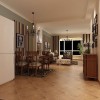 本套餐厅装饰中石膏板吊顶的设计比较具有个性,也不难从中看出时尚装饰的设计感,深色的装饰木条在白色的石膏板背景下显得更加显眼,井格形状的设计虽然简单,但同时也很富有大气之势,与空间内的整体装饰搭配在一起比较协调。