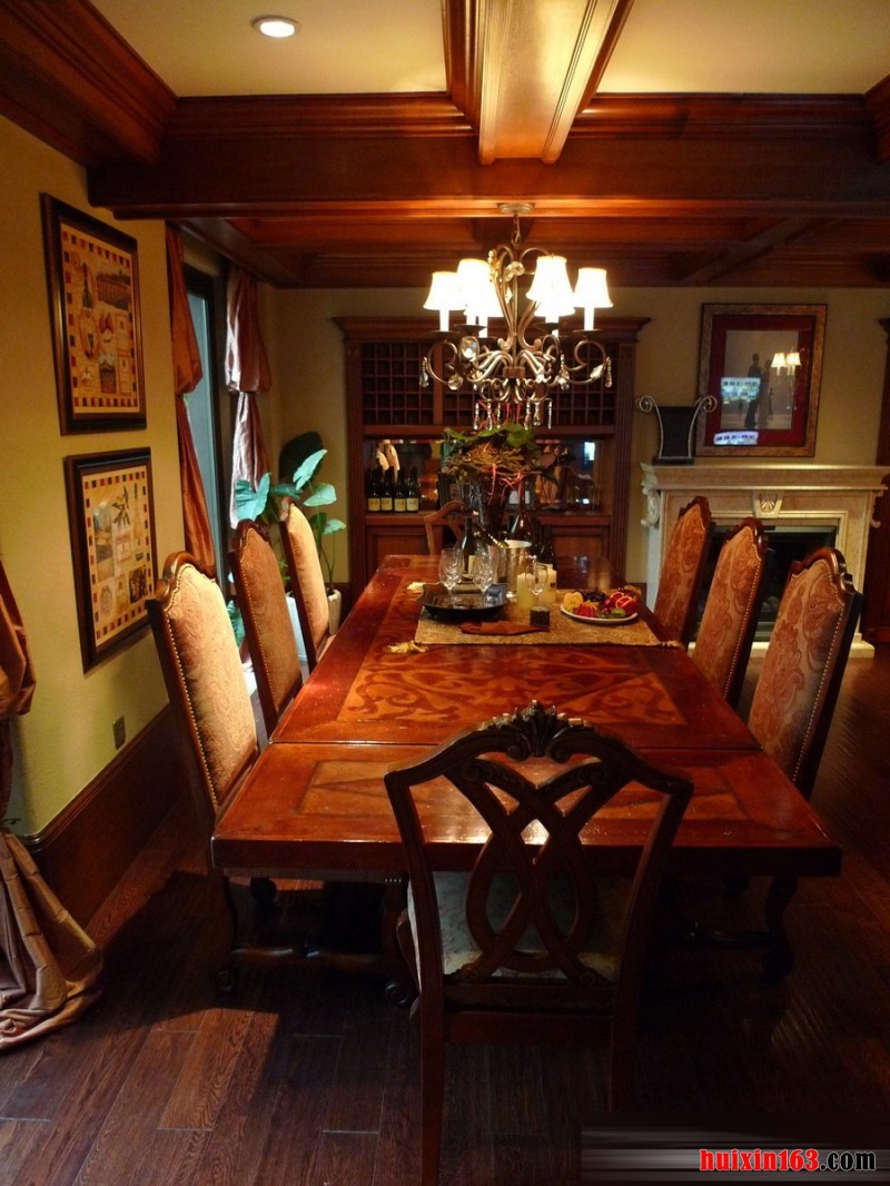 本套餐厅装饰的整体效果可以带给人们一种华丽感,空间内的石膏板吊顶采用了平顶式的设计,四周的夹层设计十分简洁,白色的灯带可以将中间的水晶吊灯衬托的更加唯美,华丽的灯饰搭配上精致的实木餐桌,似乎更能突显美式风格的装饰特点。