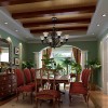 本套餐厅装饰的整体效果可以带给人们一种华丽感,空间内的石膏板吊顶采用了平顶式的设计,四周的夹层设计十分简洁,白色的灯带可以将中间的水晶吊灯衬托的更加唯美,华丽的灯饰搭配上精致的实木餐桌,似乎更能突显美式风格的装饰特点。