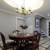 本套餐厅装饰的设计可以带给人们一种大气感,空间内的装饰色彩主要是以白色为主,石膏板吊顶的设计采用了凹凸造型,使整个空间的装饰都显得十分具有立体感,中间的金属材质吊灯的造型也是十分别致的,比较具有现代装饰气息。