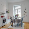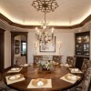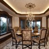 本套餐厅装饰中空间内的主色调是以奶白色为主,整体可以营造出一种温馨舒适的氛围,石膏板吊顶的设计比较独特不规则的造型使整个空间都显得十分通透,挑高的设计也可以将中间的吊灯衬托的更加华美、精致。