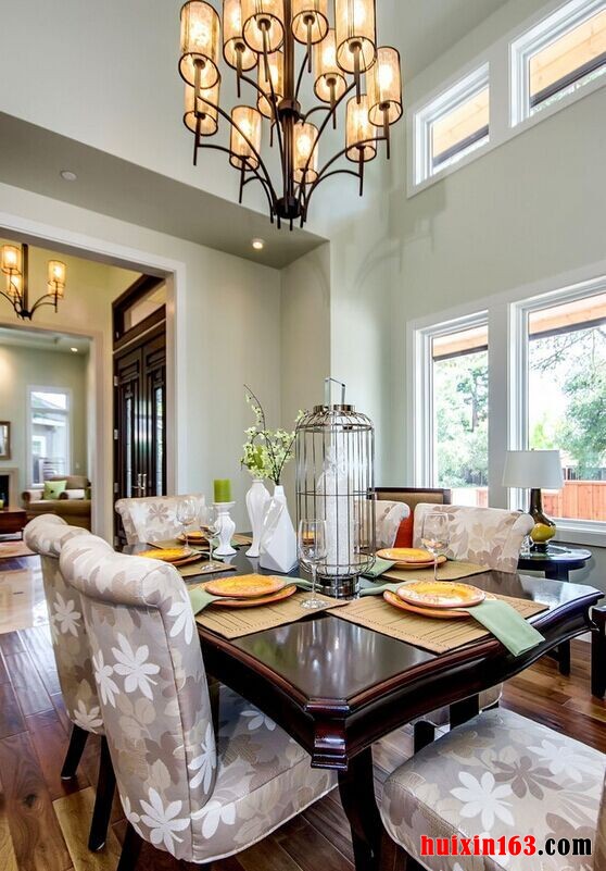 本套餐厅装饰中空间内的主色调是以奶白色为主,整体可以营造出一种温馨舒适的氛围,石膏板吊顶的设计比较独特不规则的造型使整个空间都显得十分通透,挑高的设计也可以将中间的吊灯衬托的更加华美、精致。