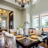 本套餐厅装饰中空间内的主色调是以奶白色为主,整体可以营造出一种温馨舒适的氛围,石膏板吊顶的设计比较独特不规则的造型使整个空间都显得十分通透,挑高的设计也可以将中间的吊灯衬托的更加华美、精致。