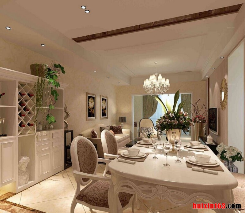 本套餐厅装饰中空间内的色彩搭配主要是以白色为主,石膏板吊顶的设计比较简洁,但又十分具有个性,圆形的凹槽设计可以与下方的实木餐桌形成一种协调的呼应,更赋有“团团圆圆”的美意。