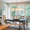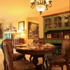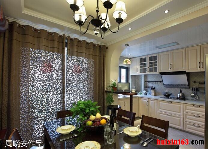 本套餐厅装饰中空间内的色彩搭配主要是以白色为主,石膏板吊顶的设计比较简洁,但又十分具有个性,圆形的凹槽设计可以与下方的实木餐桌形成一种协调的呼应,更赋有“团团圆圆”的美意。