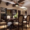 本套餐厅装饰中石膏板吊顶的设计比较简洁,纯白色的吊顶采用了平顶式的设计,并在夹层中安装了一圈白色的灯带,可以使其显得更加明亮,也为空间装饰增添了些许设计感。