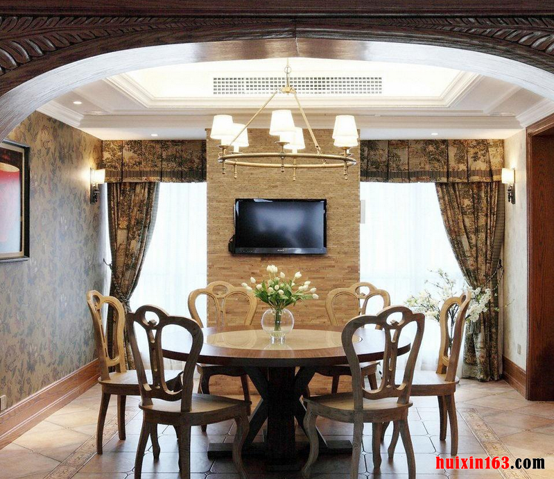 本套餐厅装饰的整体效果可以带给人们一种高贵的古典气息,空间内的石膏板吊顶中间做了圆形的凹槽设计,可以将中间的铁艺吊灯衬托的更加唯美、别致,一款实木材质的餐桌搭配上金属座椅更是可以将高雅与时尚彰显的淋漓尽致。