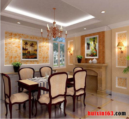 本套餐厅装饰的整体效果可以带给人们一种高贵的古典气息,空间内的石膏板吊顶中间做了圆形的凹槽设计,可以将中间的铁艺吊灯衬托的更加唯美、别致,一款实木材质的餐桌搭配上金属座椅更是可以将高雅与时尚彰显的淋漓尽致。