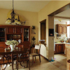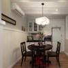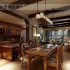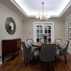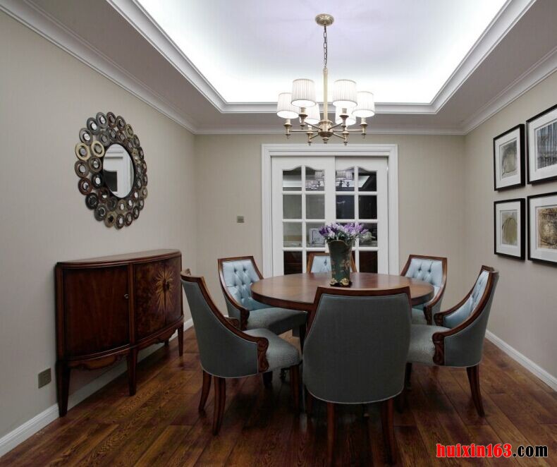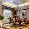 本套餐厅装饰可以带给人们一种十分大气的感觉,空间内的石膏板吊顶采用了平顶式的设计,并在四周的夹层中安装了一圈白色的灯带,中间悬挂的金属吊灯也因此而显得更加别致,并附有时尚气息。