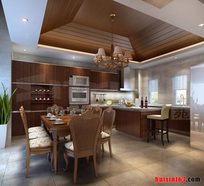 美式风格的家具不同于欧式风格家具,它并没有欧式风格那样奢华与古典,但美式风格也并不缺乏个性与大气,家具的线条设计依然是以精致为主,但它更加强调舒适与实用,在带给人们视觉享受的同时,也可以同时兼备功能性。 本套餐厅装饰可以带给人们一种十分大气的感觉,空间内的石膏板吊顶采用了平顶式的设计,并在四周的夹层中安装了一圈白色的灯带,中间悬挂的金属吊灯也因此而显得更加别致,并附有时尚气息。 更多»推荐家装效果图