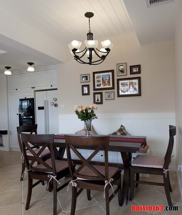 本套餐厅装饰可以带给人们一种十分大气的感觉,空间内的石膏板吊顶采用了平顶式的设计,并在四周的夹层中安装了一圈白色的灯带,中间悬挂的金属吊灯也因此而显得更加别致,并附有时尚气息。