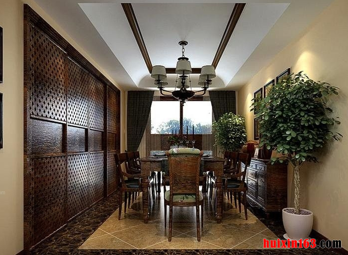 本套餐厅装饰可以带给人们一种十分大气的感觉,空间内的石膏板吊顶采用了平顶式的设计,并在四周的夹层中安装了一圈白色的灯带,中间悬挂的金属吊灯也因此而显得更加别致,并附有时尚气息。