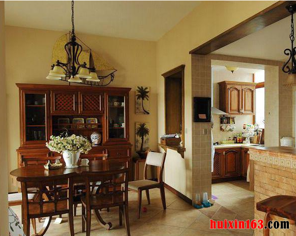美式风格的家具不同于欧式风格家具,它并没有欧式风格那样奢华与古典,但美式风格也并不缺乏个性与大气,家具的线条设计依然是以精致为主,但它更加强调舒适与实用,在带给人们视觉享受的同时,也可以同时兼备功能性。 本套餐厅装饰可以带给人们一种十分大气的感觉,空间内的石膏板吊顶采用了平顶式的设计,并在四周的夹层中安装了一圈白色的灯带,中间悬挂的金属吊灯也因此而显得更加别致,并附有时尚气息。 更多»推荐家装效果图