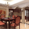 本套餐厅装饰可以带给人们一种十分大气的感觉,空间内的石膏板吊顶采用了平顶式的设计,并在四周的夹层中安装了一圈白色的灯带,中间悬挂的金属吊灯也因此而显得更加别致,并附有时尚气息。