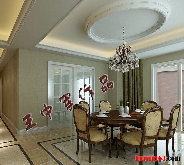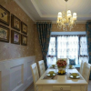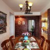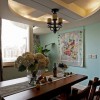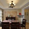 本套餐厅装饰的整体效果可以带给我们一种大气感,空间内的石膏板吊顶采用了圆形的造型设计,将中间的铁艺水晶吊灯衬托的更加唯美,同时圆形的造型也可以与下方的实木餐桌形成一种呼应。