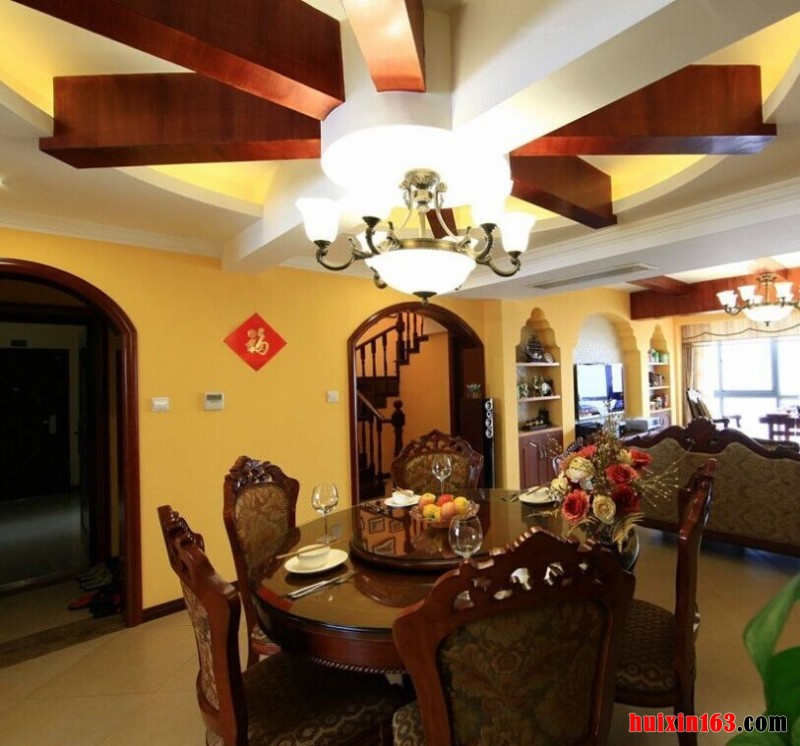 本套餐厅装饰的整体效果可以带给我们一种大气感,空间内的石膏板吊顶采用了圆形的造型设计,将中间的铁艺水晶吊灯衬托的更加唯美,同时圆形的造型也可以与下方的实木餐桌形成一种呼应。