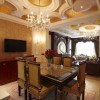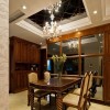 本套餐厅装饰的整体效果可以带给我们一种大气感,空间内的石膏板吊顶采用了圆形的造型设计,将中间的铁艺水晶吊灯衬托的更加唯美,同时圆形的造型也可以与下方的实木餐桌形成一种呼应。