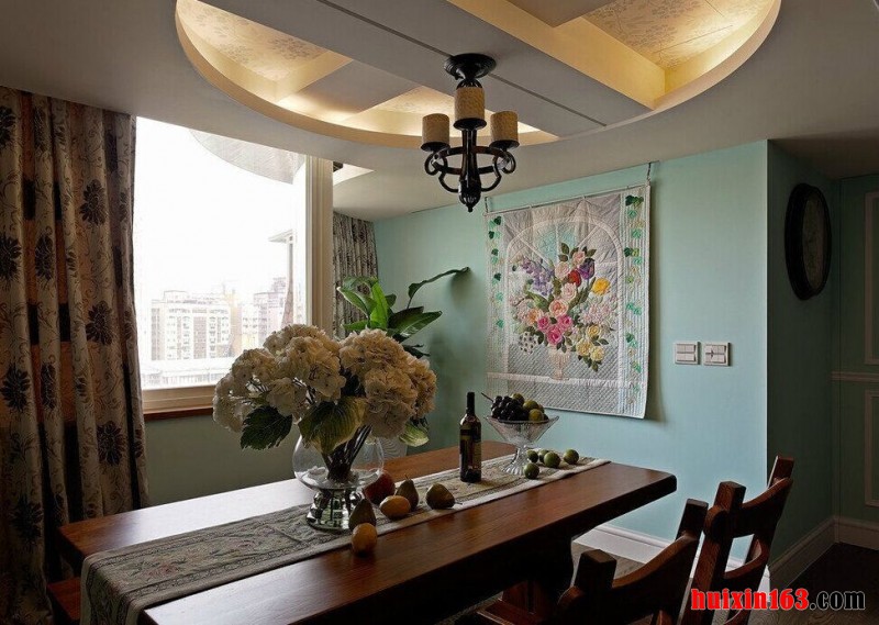 美式风格近年来也比较流行仿古风,仿古式居室装饰会更加具有古典气息,在彰显唯美的同时也会彰显历史文化,空间内的每一个角落中都会散发着文艺气息,与其说是一种装饰,倒不如说是带给人们的一种享受。 本套餐厅装饰的整体效果可以带给我们一种大气感,空间内的石膏板吊顶采用了圆形的造型设计,将中间的铁艺水晶吊灯衬托的更加唯美,同时圆形的造型也可以与下方的实木餐桌形成一种呼应。 更多»推荐家装效果图