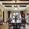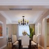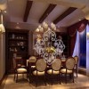 本套餐厅装饰的整体效果可以带给我们一种大气感,空间内的石膏板吊顶采用了圆形的造型设计,将中间的铁艺水晶吊灯衬托的更加唯美,同时圆形的造型也可以与下方的实木餐桌形成一种呼应。