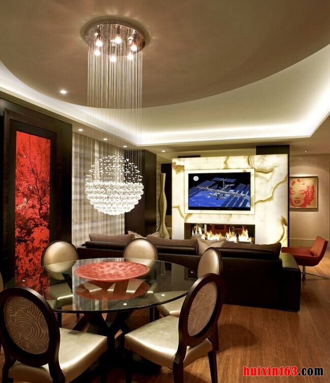 本套餐厅装饰的整体效果可以带给人们一种大气感,石膏板吊顶的饿造型设计比较别致,并搭配了深色的壁纸做装饰,整体可以营造出一种华美的感觉,也可以将中间的铁艺吊灯衬托的更加别致。