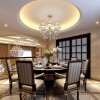 本套餐厅装饰的整体效果可以带给人们一种大气感,石膏板吊顶的饿造型设计比较别致,并搭配了深色的壁纸做装饰,整体可以营造出一种华美的感觉,也可以将中间的铁艺吊灯衬托的更加别致。