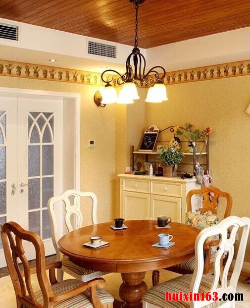 本套餐厅装饰的整体效果可以带给人们一种大气感,石膏板吊顶的饿造型设计比较别致,并搭配了深色的壁纸做装饰,整体可以营造出一种华美的感觉,也可以将中间的铁艺吊灯衬托的更加别致。
