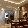 本套餐厅装饰中空间内的装饰色调主要是以白色为主,空间内的石膏板吊顶设计比价时尚同时也充满了大气之势,白色的背景将中间的铁艺吊灯衬托的更加具有个性,下方的实木餐桌也因此显得更加典雅。