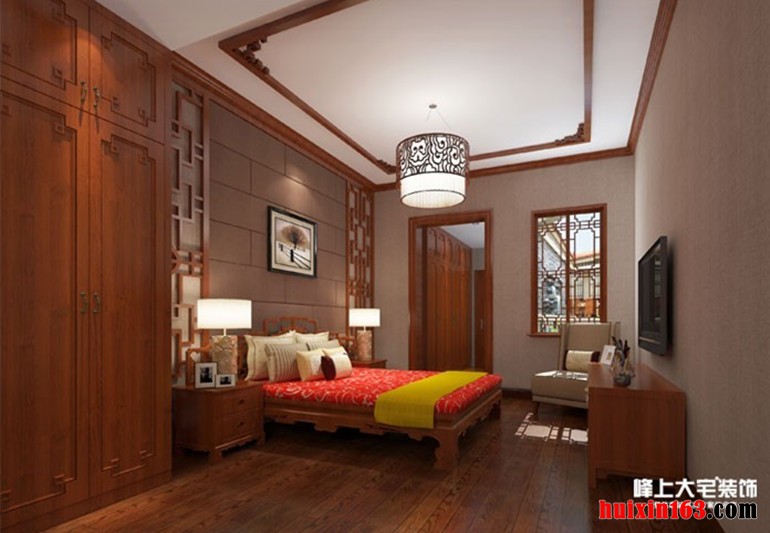 卧室使用单纯的线条,简单的建筑细节,利用软装饰和艺术品点缀空间,使空间显得和谐,淡雅,让我们从中领略古典家居风韵的同时,也有对未来生活的追求。空间不同于传统古典家居的“精雕细琢”,取而代之的是简洁与明快的步调,营造出极富中国特色的大方稳重的生活空间。